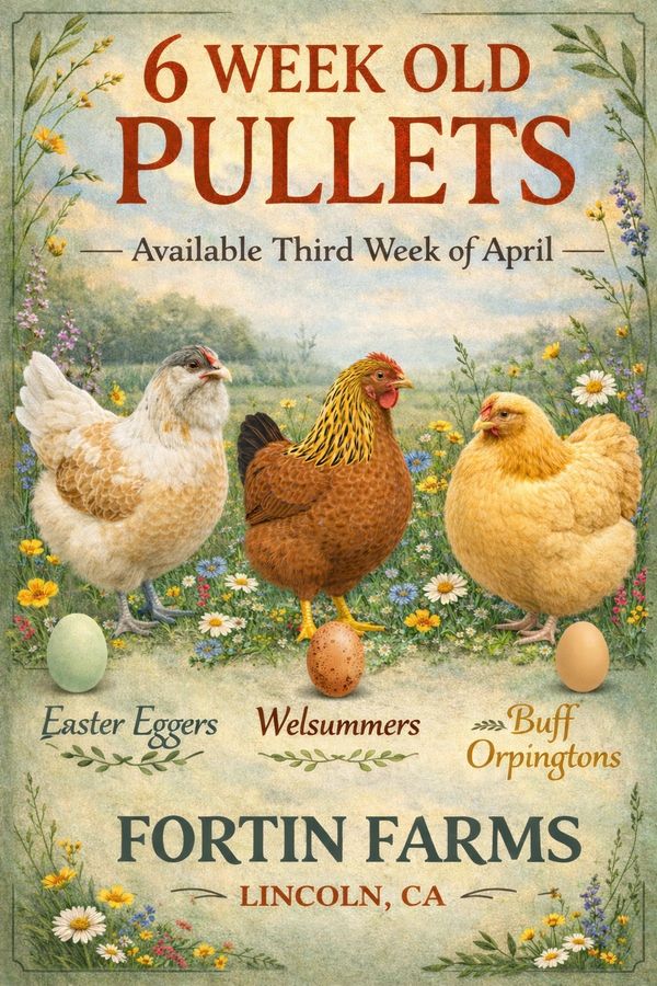 We will have 6-week-old cinnamon queens ($25), welsummer ($30) and easter eggers ($30) available the third week of april. All pullets are first come first serve. We do not accept reservations. We will announce when they are old enough to go to new coops and available for purchase.